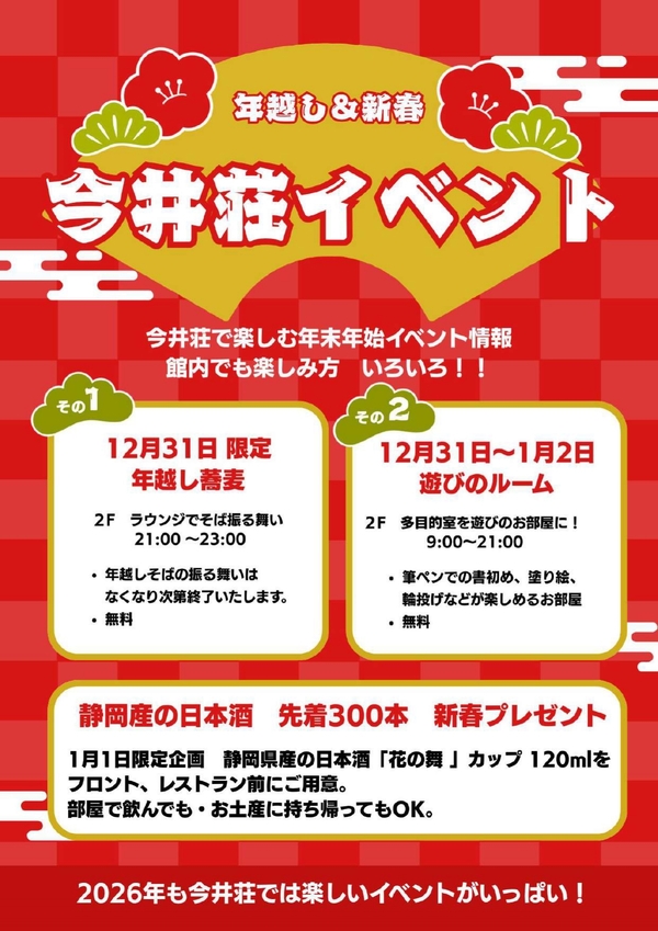 いよいよ年の瀬を迎え、今井荘では年末年始をゆったりと、そして楽しくお過ごしいただけるようイベントをご用意いたしました。